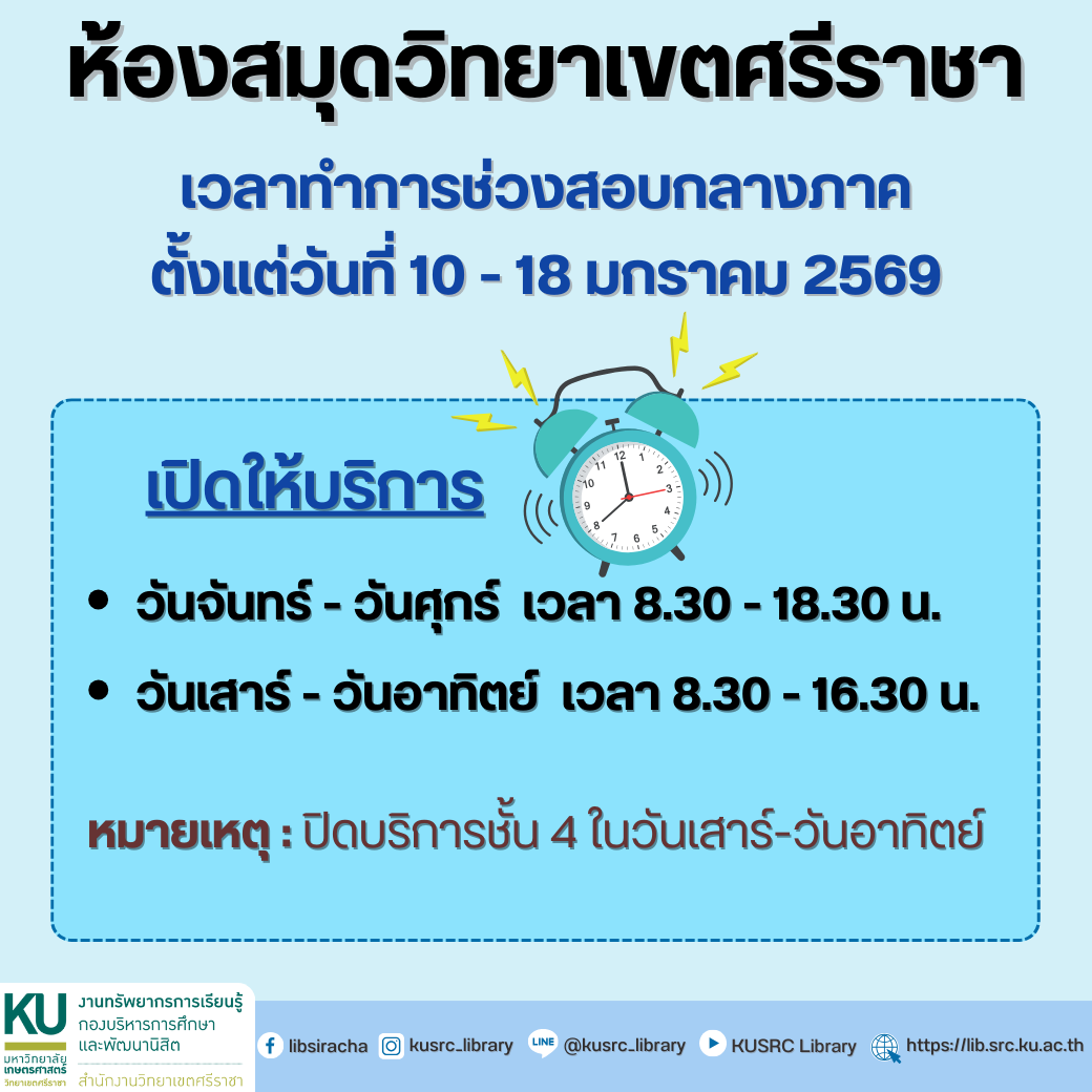 เวลาทำการช่วงสอบกลางภาคเรียนต้นตั้งแต่วันที่ 10 - 18 มกราคม 2569